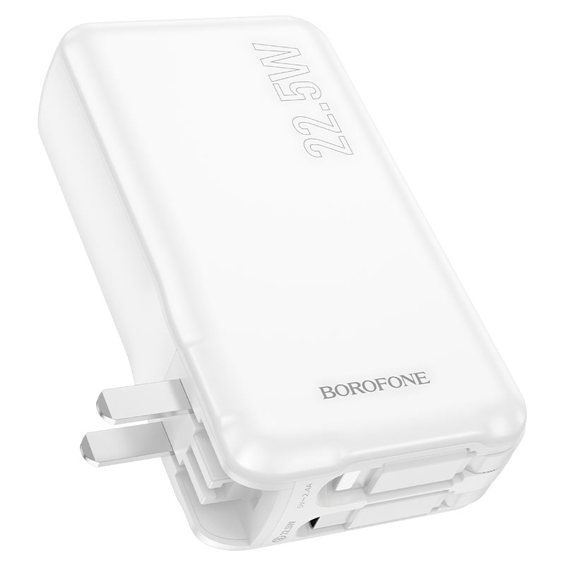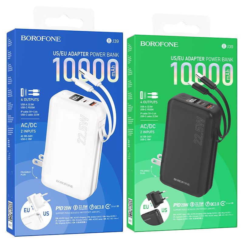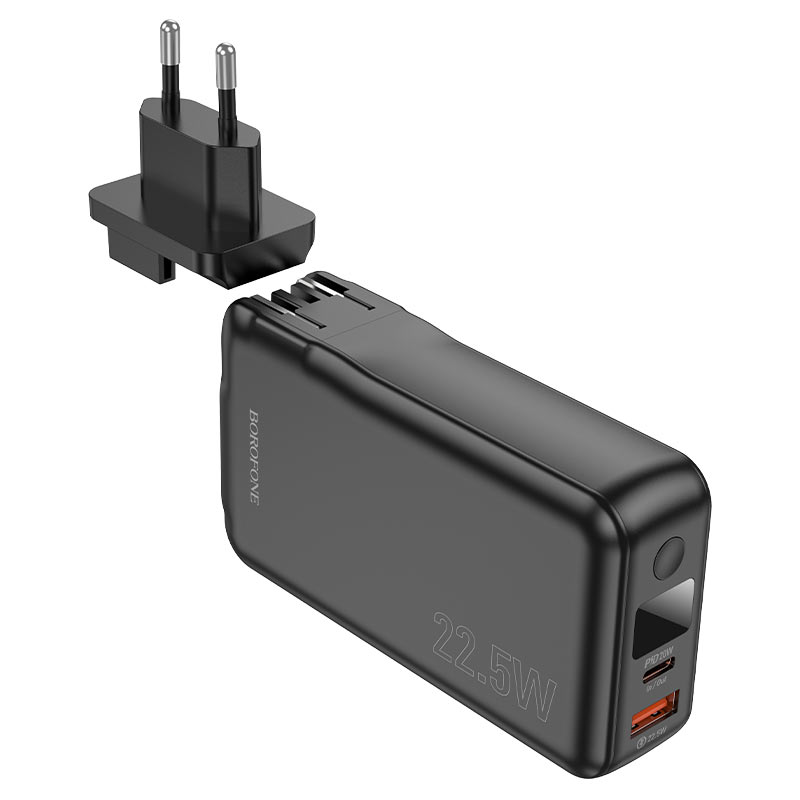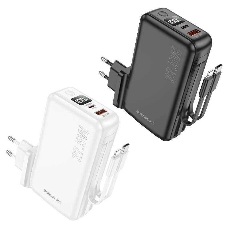 BOROFONE BJ39 Follower, US / EU plug or USB-C inputs, USB-C / USB-A outputs, 2 built-in cables, supports fast charging protocols, LED digital display