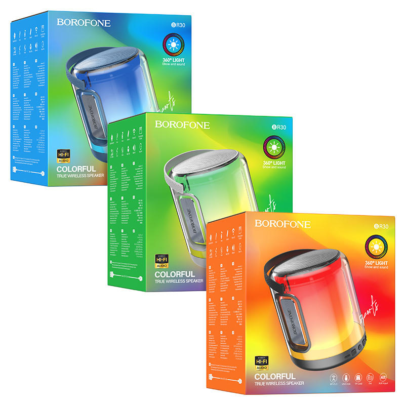 BOROFONE BR30 Auspicious, wireless speaker, 360° RGB lighting, BT v5.3, 2400mAh battery for 4 hours of use, supports BT, TF card, USB flash drive, FM, AUX, TWS playback modes